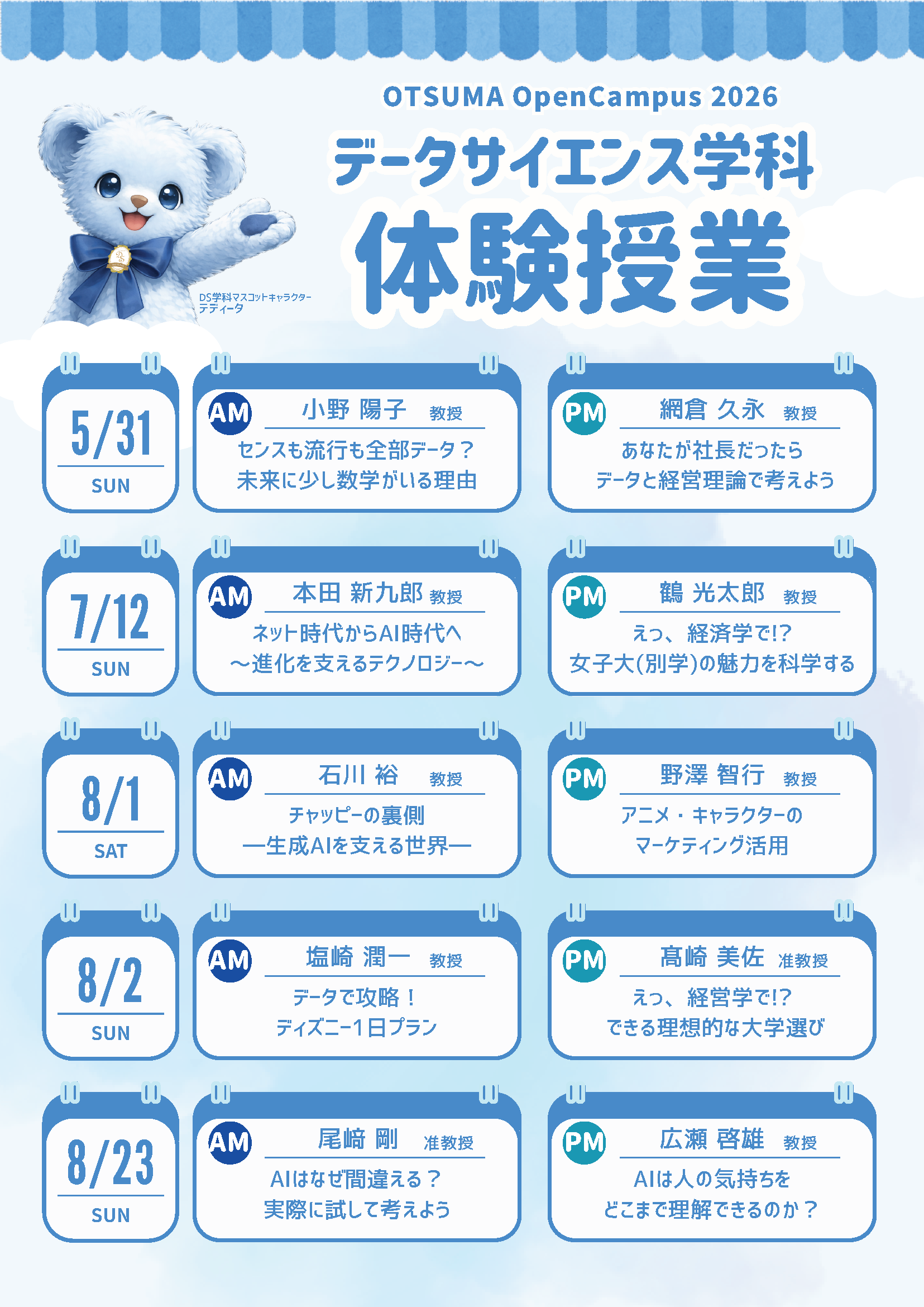 オープンキャンパスの体験授業テーマ決定 今年度のオープンキャンパスの体験授業テーマが決定しました。 今年も本学部では、10名の教員が担当し、各日程ごとに2つの体験授業を実施します。 さまざまな分野のテーマがあり、本学部の学びの幅広さを感じていただけると思います。 ぜひ複数回ご参加いただき、いろいろな先生の授業を体験してみてください。 データサイエンスの面白さや魅力を感じていただけるはずです。 オープンキャンパスの参加方法や詳細は大学HPをご覧ください。 prev